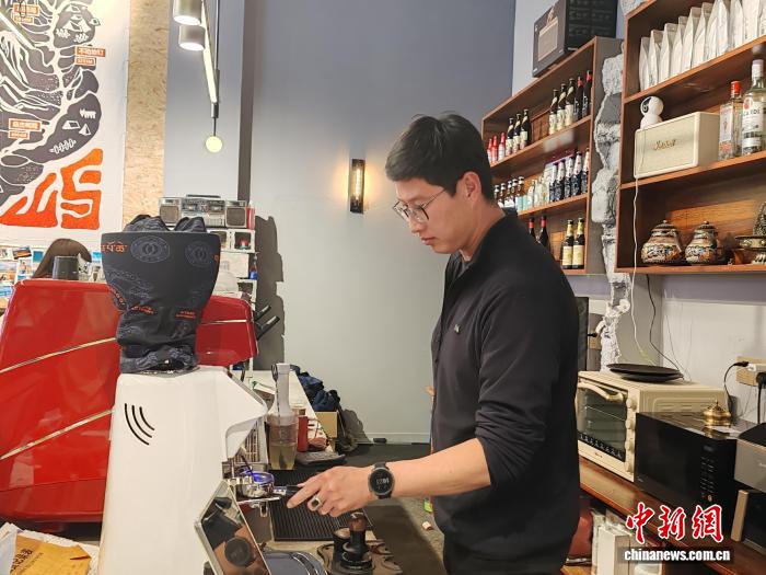 7月21日,Liu Bo在他的商店里经营了一家咖啡机。中国新闻社记者摄影摄影摄影