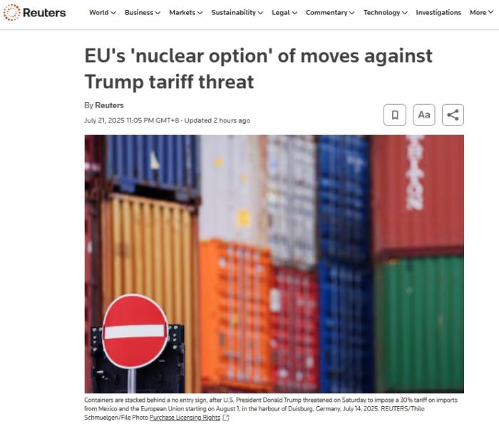 路透社说,欧盟尚未使用针对美国针对美国发起的反法规(ACI)机制。该级别远远超过了美国的报复率,并且被外界视为“最终威慑工具”。
